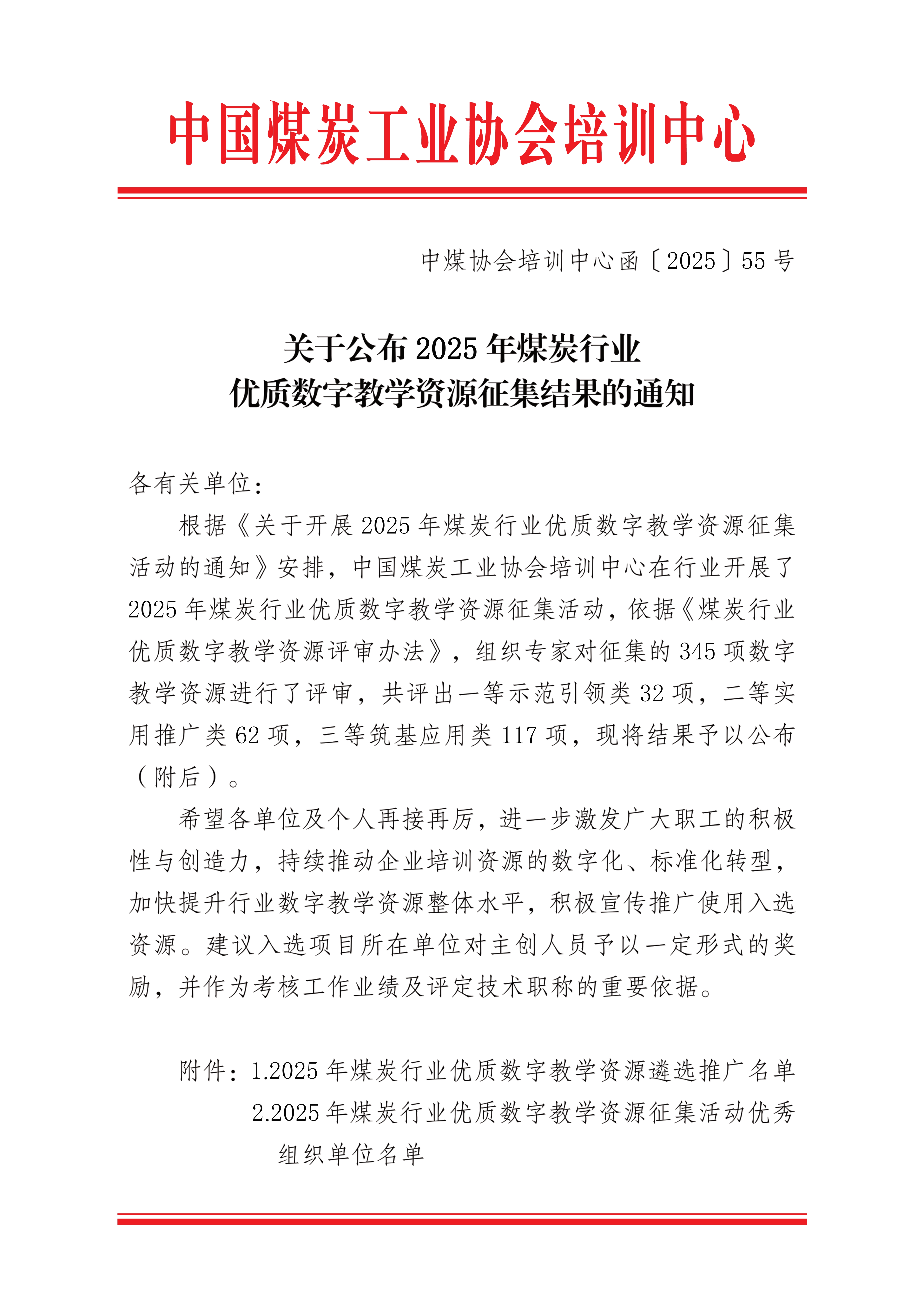 关于公布2025年煤炭行业优质数字教学资源征集结果的通知